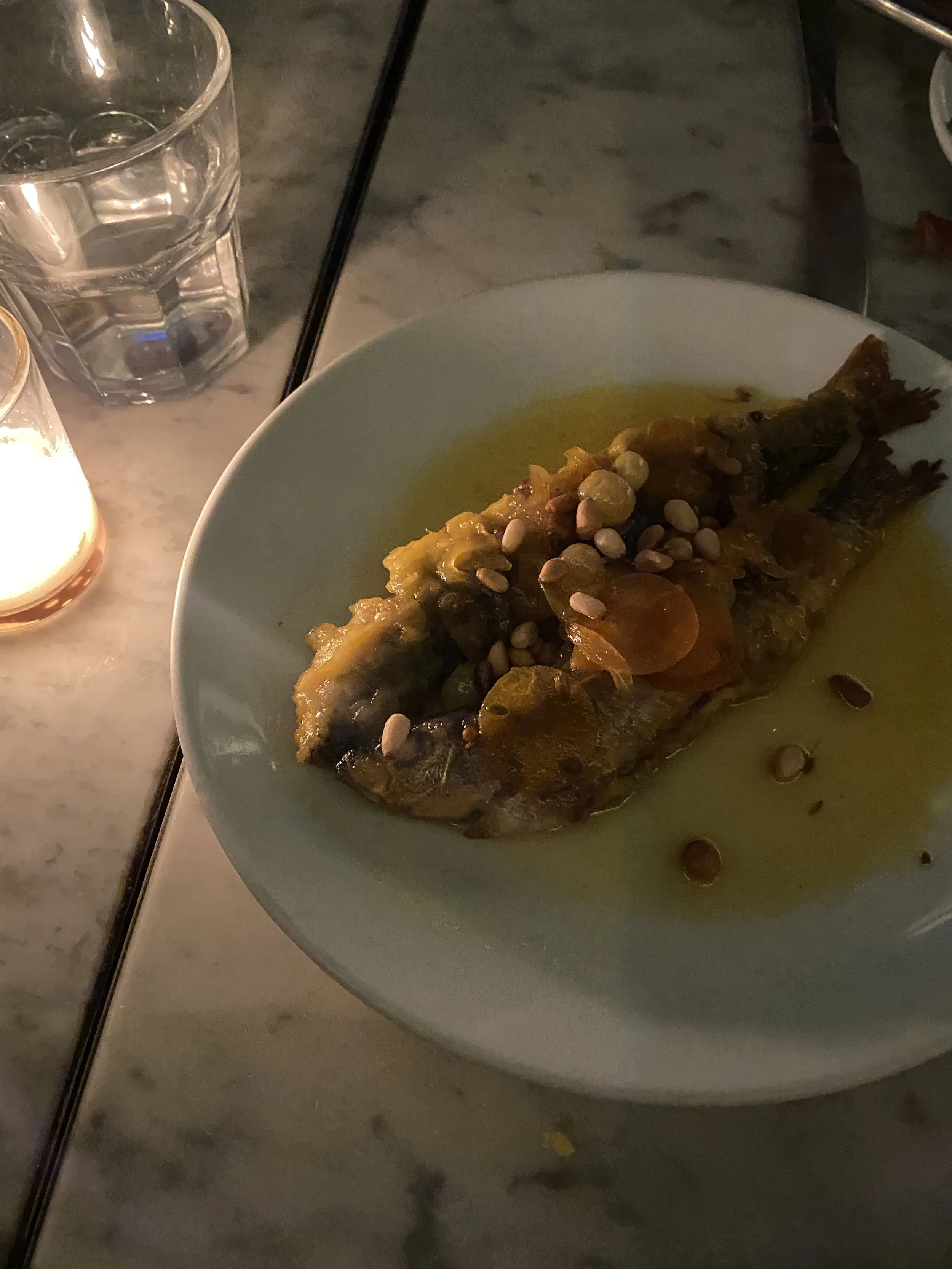 Funnily enough, the sardines that we ate alongside the peach dish almost had the opposite reaction from me. Still tasty in their own right, they came prepared with fruits (perhaps some sort of orange) that made them quite sweet. Still prepared well, just not to my taste. I’ve never been particularly partial to sweet main dishes. I haven’t the biggest sweet tooth (though, of course, there is a time and place for desserts. Cakes and pastries. I won’t say no.), and whilst I can eat without much fuss, they just don’t envigorate me like their savoury and umami-driven plates do.